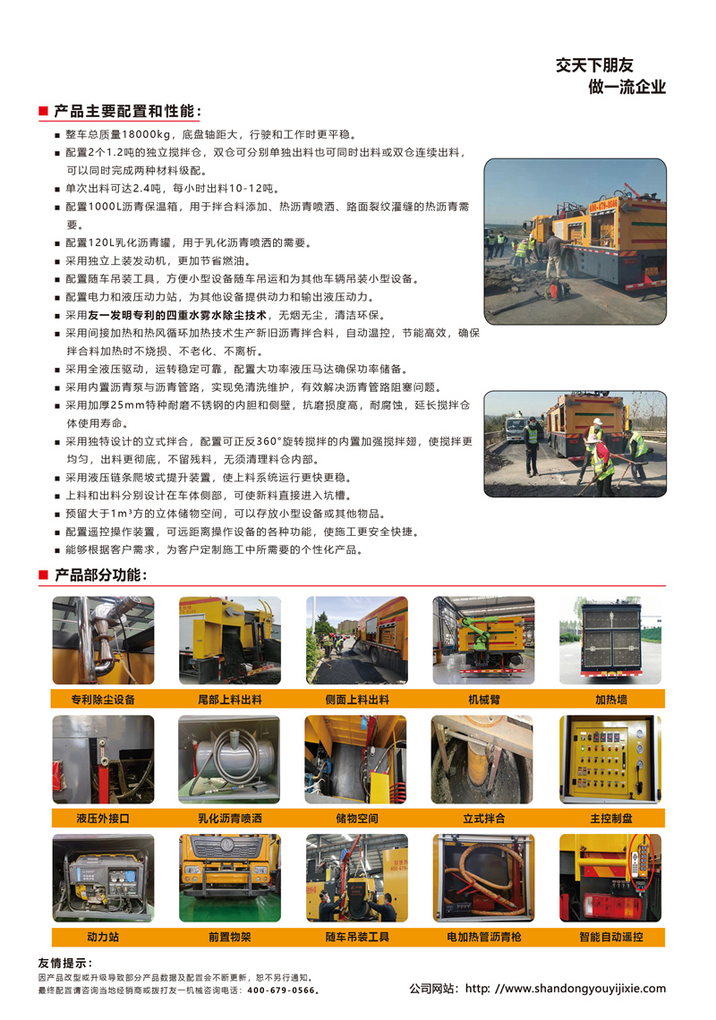 山東友浚智能裝備有限公司主要生產(chǎn)路面綜合養(yǎng)護(hù)車、瀝青路面養(yǎng)護(hù)車、道路養(yǎng)護(hù)車、瀝青熱再生修補(bǔ)車、瀝青灌縫機(jī),專注、專業(yè)于道路養(yǎng)護(hù)機(jī)械設(shè)備與養(yǎng)護(hù)材料的生產(chǎn)和研發(fā)。